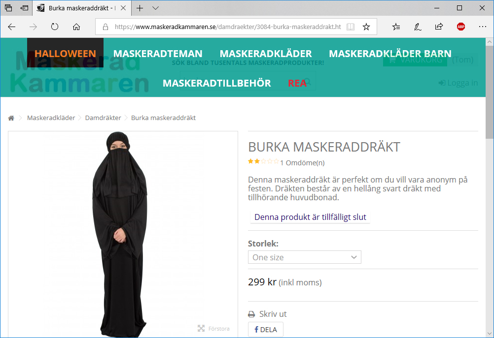 Aftonbladet rapporterar att Danielle Hillerström stötte på en burka som maskeraddräkt när hon surfade runt på Maskeradkammaren. Så här i tider av oktoberfest och Halloween kan hon inte ha missat de katolska prästerna och tyrolerdräkterna. Däremellan finns det hawaiianska kläder och indiandräkter. De traditionella alternativen för den som inte vill tillverka sin egna dräkt finns – enkelt och praktiskt!