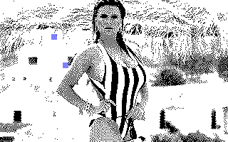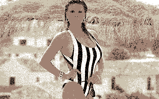 An image is a two-dimensional array of colored pixels, in this case 200 rows pf 320 pixels (320×200), today typically a 2-dimensional pixel array. Color indexing is the concept of replacing the 24-bit pixels with an 8-bit pointer to a color palette, thus reducing the memory required to represent the image. Character compression is the concept of replacing the pixel matrix with a matrix of references to a palette of 8×8 cells. Fewer bits per pixel results in poorer quality, but higher probability of finding similar 8×8 cells, and therefore a smaller image. More bits per pixel results in higher quality, but less probability of finding similar 8×8 cells, and therefore a larger image. The technique does not work well on photographic images. I use these original images: