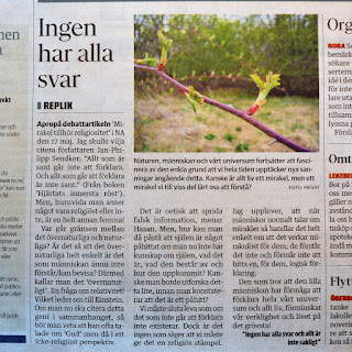 Under rubriken “ingen har alla svar” får vi lära oss att inte allt går att förklara, och att sådant som inte kan förklaras, endast kan förklaras genom magi. Det är en folkligt välförankrad hållning som gärna låter sig kryddas med grundlösa referenser till Albert Einstein, eftersom en känd fysiker som i det närmaste uppnått metafysisk status och som sedan länge inte kan försvara sig när hans namn missbrukas, kan användas till att ge legitimitet åt precis vad som helst.Specifikt är det två påståenden skribenten gör som behöver bemötas. För det första så är inte själen något mysterium för vetenskapen, trots att så påstås. Vi förstår definitivt inte allt som finns att förstå om självmedvetandet (som är den religiöst neutrala benämningen), men vi har lokaliserat uppfattningen om en själ till ett organ som sitter strax ovan halsen, ungefär mellan öronen. Idag är de flesta forskare överens om att huvudet fyller fler funktioner än att förvara en hatt. Sedan 1988 är det faktiskt detta organs funktion som avgör om man är levande eller död, vilket knuffade ner hjärtat från sin tidigare tillsynes ohotade tron.För det andra är det inte på något vis förminskande att tro att människan är kapabel att förklara det vi ser omkring oss. Den som skriver att detta skulle vara förminskande har själv, på väldigt lösa grunder, sagt att magi ska användas som förklaring där vetenskapliga hypoteser saknas. Men om vi som art ska nå vår fulla värdighet, gör vi bättre i att acceptera okunskap i väntan på en fungerande teori istället för att stänga en fråga med hänvisning till övernaturliga krafter. Historien har hittills aldrig sagt oss att ett förbryllande naturfenomen i själva verket är resultatet av gudars och demoners magiska krafter.Anders HesselbomOrdförande Humanisterna Örebro