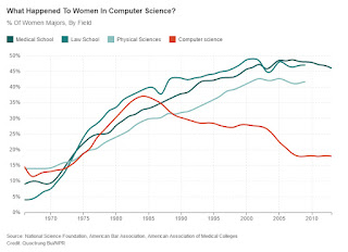 2014 publicerade NPR en kort och mycket intressant artikel med rubriken ”när kvinnor slutade koda”. (I detta fall är koda slang för att programmera datorer.) Med en graf visade man hur andelen kvinnor på utbildningar inom medicin, juridik, fysik och datavetenskap följdes åt från 1970 till tidigt 80-tal, och därefter har de tre förstnämnda följts åt, medan kvinnorna inte längre studerar datavetenskap.