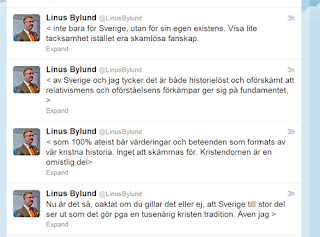 Linus Bylund är Jimmie Åkessons (SD) pressekreterare, och han kommenterar skolans konfessionsfrihet på twitter. Läs inläggen nerifrån och upp: