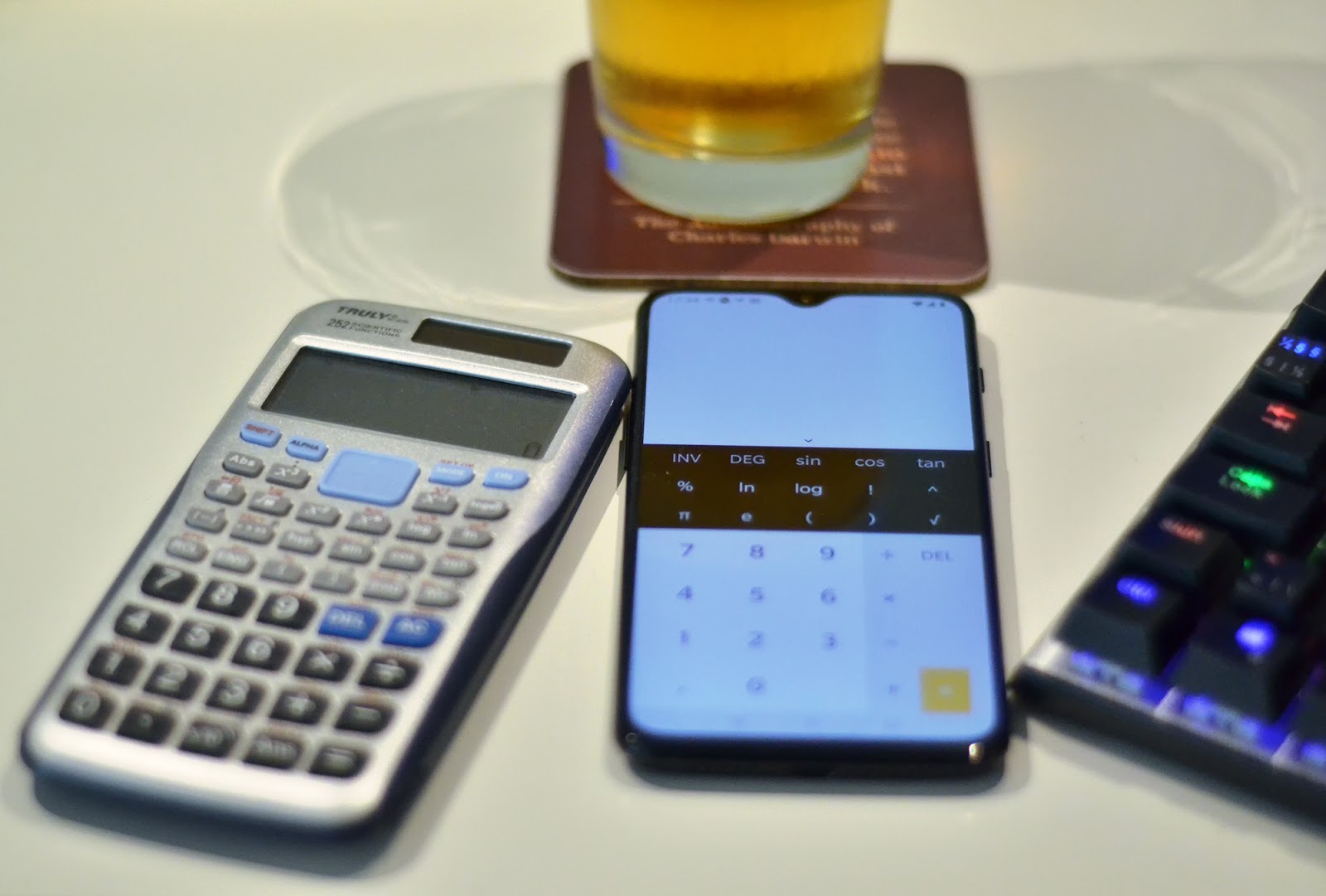 Diskussionen kan spåras tillbaka till den tid då kalkylatorn var en ifrågasatt lyx, eftersom man, som det hette då, ändå aldrig kommer bära med sig en miniräknare. Ibland slår kritiken mot tekniken fel, men ibland slår den rätt. Den högst subjektiva poäng som jag vill göra, kan summeras i denna bild. Det är så här min arbetsplats i hemmet ser ut. Förutom ölen och en NUC (som tangentbordet är kopplat till) så äger jag en mobiltelefon med en mjukvarudriven miniräknare (som jag ogärna använder) och en hårdvarudriven miniräknare.