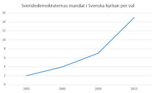 Och detta diagram visar antal mandat Sverigedemokraterna vunnit i de senaste kyrkovalen.