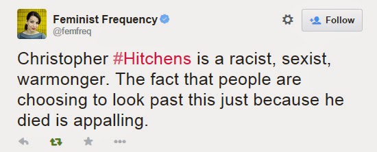 Så här skrev t.ex. Anita Sarkeesian på Twitter 17/12 2011, alltså två dagar efter Christipher Hitchens bortgång:
