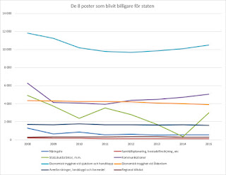 Uppdelat på förändring från 2008 till 2015 ser det ut så här: Det som blivit mycket billigare genom åren är näringslivet (-131%), bostadsförsörjning (-75%), infrastrukturen för kommunikation (-65%) och sjukdomsersättningen (-25%). Totalt har åtta utgiftsposter minskat. Dessa är även näringsliv, bostadsförsörjning, statsskuldsräntor (!), ekonomisk trygghet vid sjukdom/handikapp (!!), ekonomisk trygghet vid ålderdom (!!!), landsbygdsnäringar (!!!!) samt regional tillväxt (!!!!!).